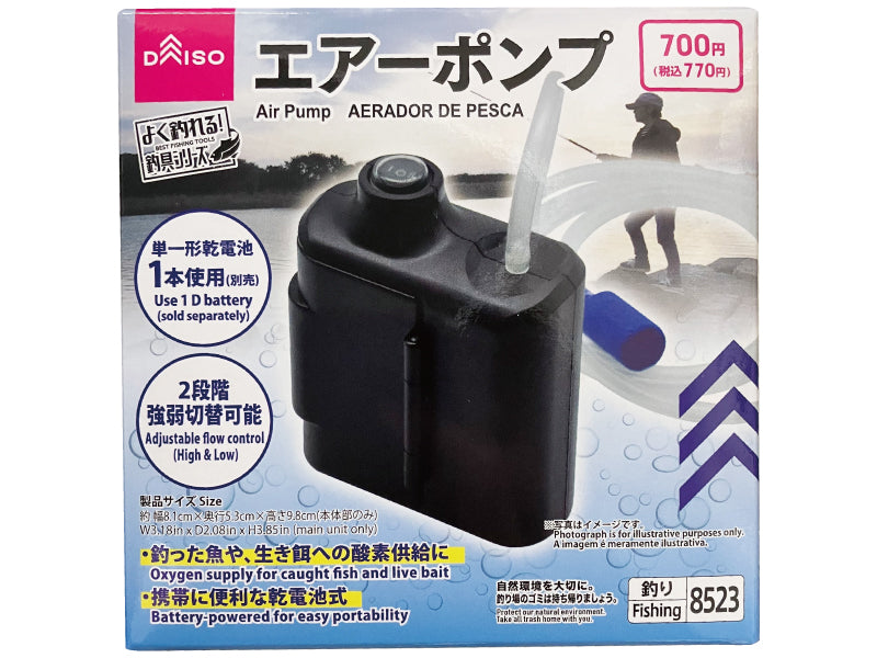 泳がせ釣り用の活餌を生かすために酸素供給として使われるエアーポンプですが、他社メーカーでは平均して2,000円〜3,000円を超える製品がわずかダイソーなら770円で購入できるコスパの高さ。