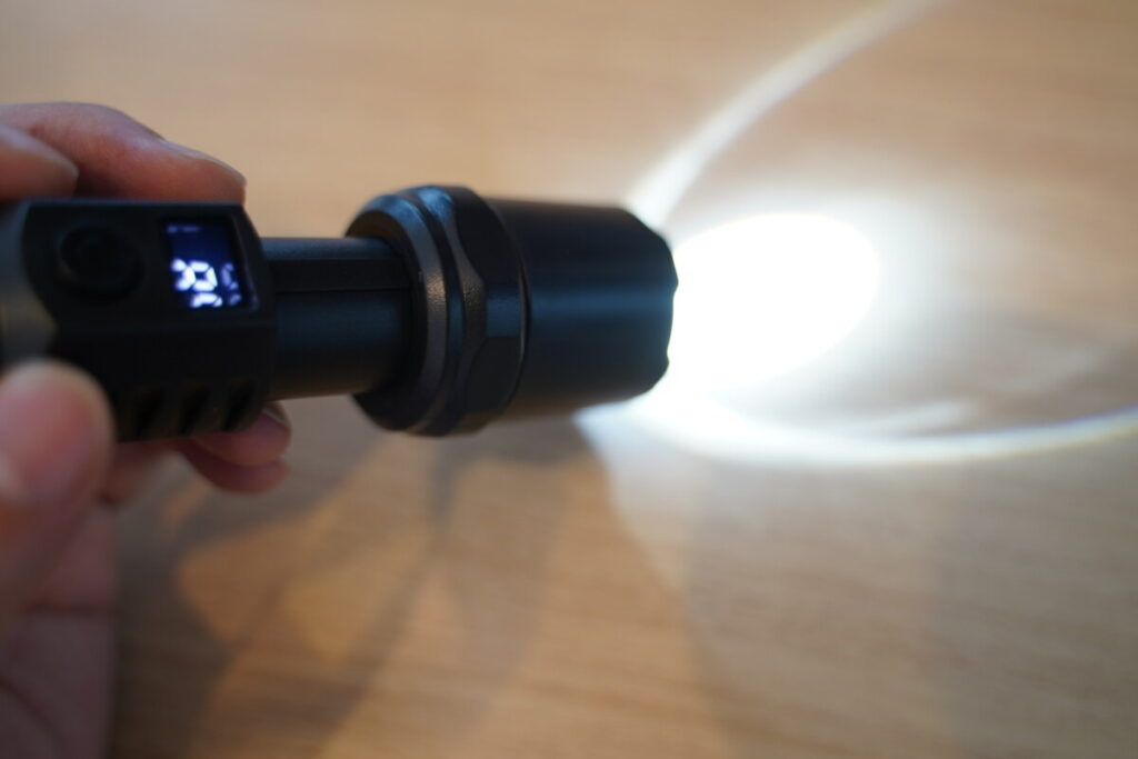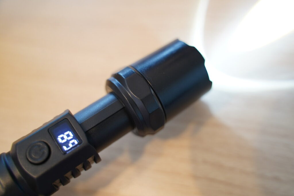 軽量なプラ素材にバッテリー残量ディスプレイ、Highモードで230ルーメン(2.5時間)、Lowモードで110ルーメン(4時間)、点滅(2時間)の3モードをワンボタンで切り替えるシンプルなLEDライトです。