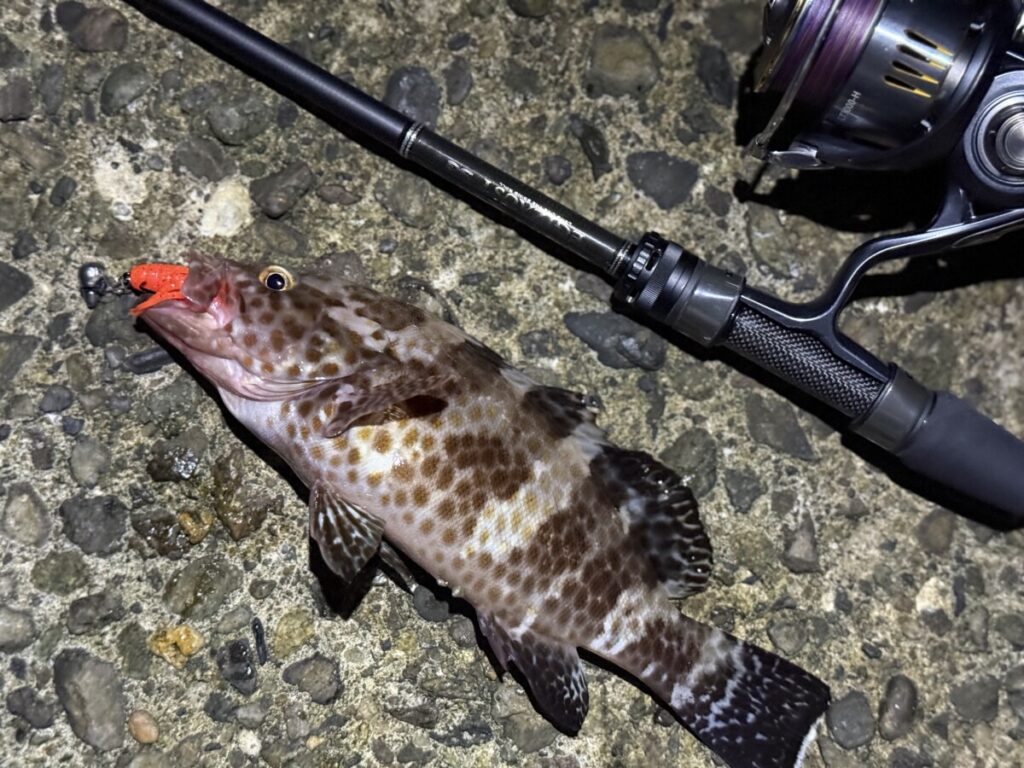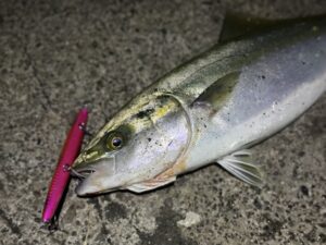 暗くなってじっくり見せるならフリーフォールではなくテンションフォールで巻き回数を3〜5回(ストップ&ゴー)でじっくり攻めるのもあり。渋い状況の中でマゴチがかかり、激しい首振りでも余裕でファイトできました。